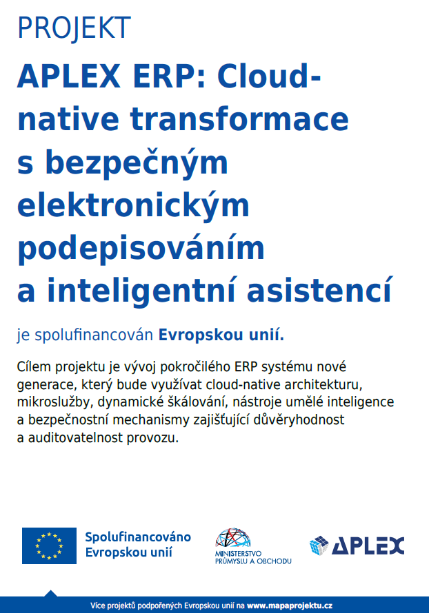 Projekt „APLEX ERP: Cloud-native transformace s bezpečným elektronickým podepisováním a inteligentní asistencí“ je spolufinancován Evropskou unií a je realizován v rámci Operačního programu Technologie a aplikace pro konkurenceschopnost (OP TAK), v aktivitě Aplikace – výzva II: vývoj digitálních řešení.